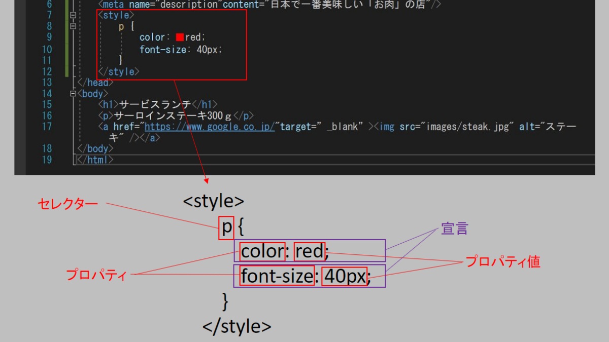 「color: blue;」は、それぞれプロパティと値で「青色」を指定。 - 「p」はセレクターでHTMLファイルの「p」要素を指定。